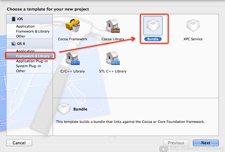 1、新建工程,选 os x——Framework & Library——Bundle