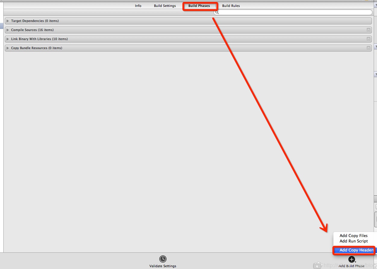 3、加 headers ,build parses —— 右下方 add bulids parses【Xcode5 我记得是上面菜单的Editor 里面有】 —— add copy headers 然后添加.h