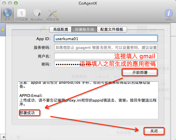配置,按照下图填入,然后【开始部署】直到【部署成功】,点击【关闭】