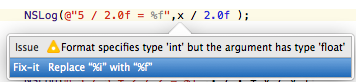 NSLog(@"5 / 2.0f = %0.1f",x / 2.0f );