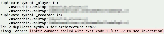 错误信息: ld: duplicate symbol XXX in: