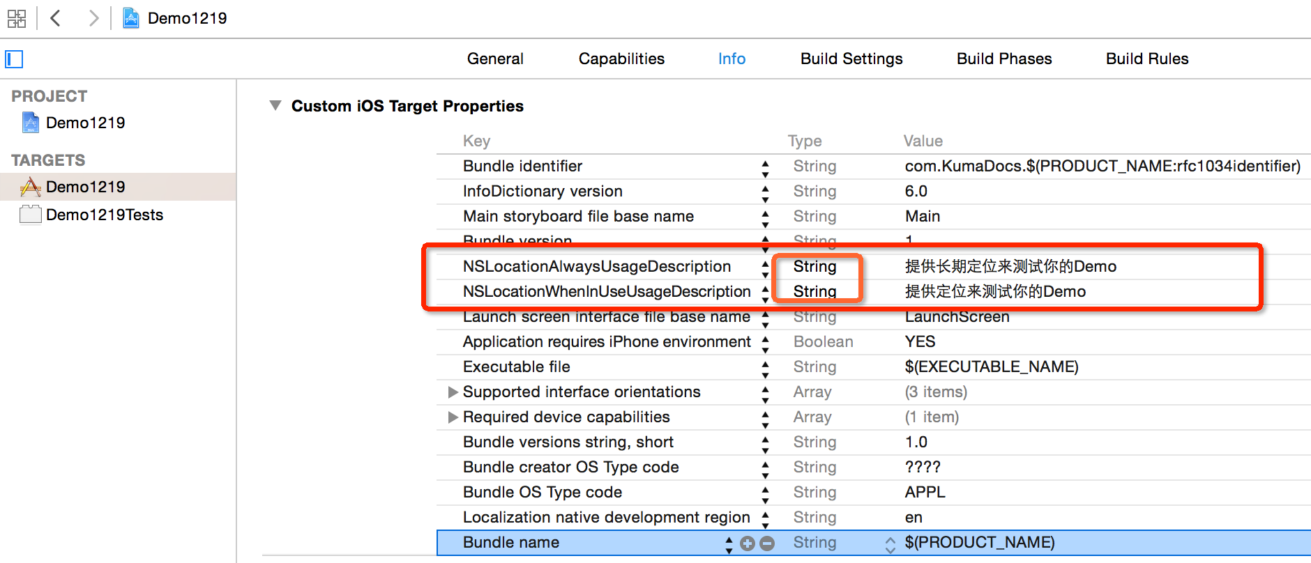 key为NSLocationWhenInUseUsageDescription string类型 value随便写用于描述