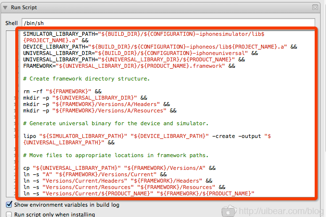 FRAMEWORK=”${UNIVERSAL_LIBRARY_DIR}/${PRODUCT_NAME}.framework” &&